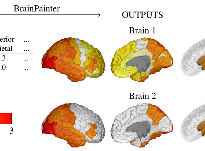 We present BrainPainter, a software that automatically generates images of highlighted brain structures given a list of numbers corresponding to the output colours of each region. Compared to existing visualisation software (i.e. Freesurfer, SPM, 3D Slicer), BrainPainter has three key advantages: (1) it does not require the input data to be in a specialised format, allowing BrainPainter to be used in combination with any neuroimaging analysis tools, (2) it can visualise both cortical and subcortical structures and (3) it can be used to generate movies showing dynamic processes, e.g. propagation of pathology on the brain. We highlight three use cases where BrainPainter was used in existing neuroimaging studies: (1) visualisation of the degree of atrophy through interpolation along a user-defined gradient of colours, (2) visualisation of the progression of pathology in Alzheimer’s disease as well as (3) visualisation of pathology in subcortical regions in Huntington’s disease. Moreover, through the design of BrainPainter we demonstrate the possibility of using a powerful 3D computer graphics engine such as Blender to generate brain visualisations for the neuroscience community. Blender’s capabilities, e.g. particle simulations, motion graphics, UV unwrapping, raster graphics editing, raytracing and illumination effects, open a wealth of possibilities for brain visualisation not available in current neuroimaging software. BrainPainter is customisable, easy to use, and can run straight from the web browser: this https URL , as well as from source-code packaged in a docker container: this https URL . It can be used to visualise biomarker data from any brain imaging modality, or simply to highlight a particular brain structure for e.g. anatomy courses.
