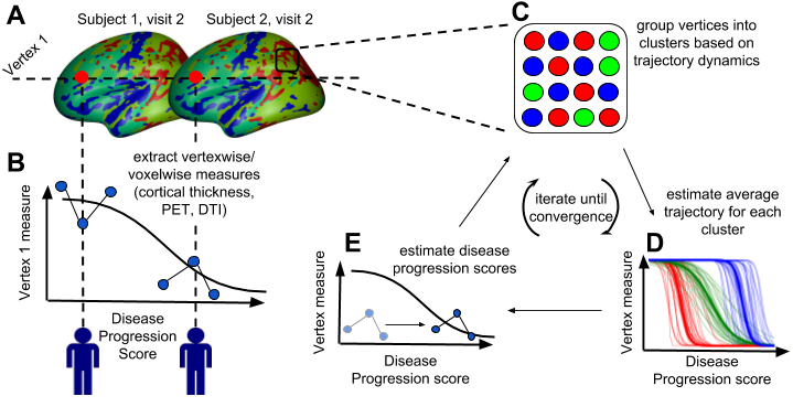 Here we present DIVE: Data-driven Inference of Vertexwise Evolution. DIVE is an image-based disease progression model with single-vertex resolution, designed to reconstruct long-term patterns of brain pathology from short-term longitudinal data sets. DIVE clusters vertex-wise biomarker measurements on the cortical surface that have similar temporal dynamics across a patient population, and concurrently estimates an average trajectory of vertex measurements in each cluster. DIVE uniquely outputs a parcellation of the cortex into areas with common progression patterns, leading to a new signature for individual diseases. DIVE further estimates the disease stage and progression speed for every visit of every subject, potentially enhancing stratification for clinical trials or management. On simulated data, DIVE can recover ground truth clusters and their underlying trajectory, provided the average trajectories are sufficiently different between clusters. We demonstrate DIVE on data from two cohorts: the Alzheimer’s Disease Neuroimaging Initiative (ADNI) and the Dementia Research Centre (DRC), UK, containing patients with Posterior Cortical Atrophy (PCA) as well as typical Alzheimer’s disease (tAD). DIVE finds similar spatial patterns of atrophy for tAD subjects in the two independent datasets (ADNI and DRC), and further reveals distinct patterns of pathology in different diseases (tAD vs PCA) and for distinct types of biomarker data: cortical thickness from Magnetic Resonance Imaging (MRI) vs amyloid load from Positron Emission Tomography (PET). Finally, DIVE can be used to estimate a fine-grained spatial distribution of pathology in the brain using any kind of voxelwise or vertexwise measures including Jacobian compression maps, fractional anisotropy (FA) maps from diffusion imaging or other PET measures. DIVE source code is available online: https://github.com/razvanmarinescu/dive